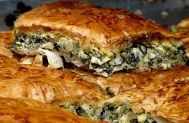 Se taie marunt frunzele de ceapa verde si mararul si se amesteca cu branza si ouale. Se ung cu ulei foile de placinta, apoi se pune jumatate din compozitie pe jumatate de foaie, iar cealalta jumatate se asaza peste umplutura.