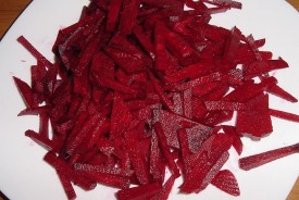 Salata de sfecla rosie se obtine amestecand sfecla cu otet, sare, ulei si hrean ras.